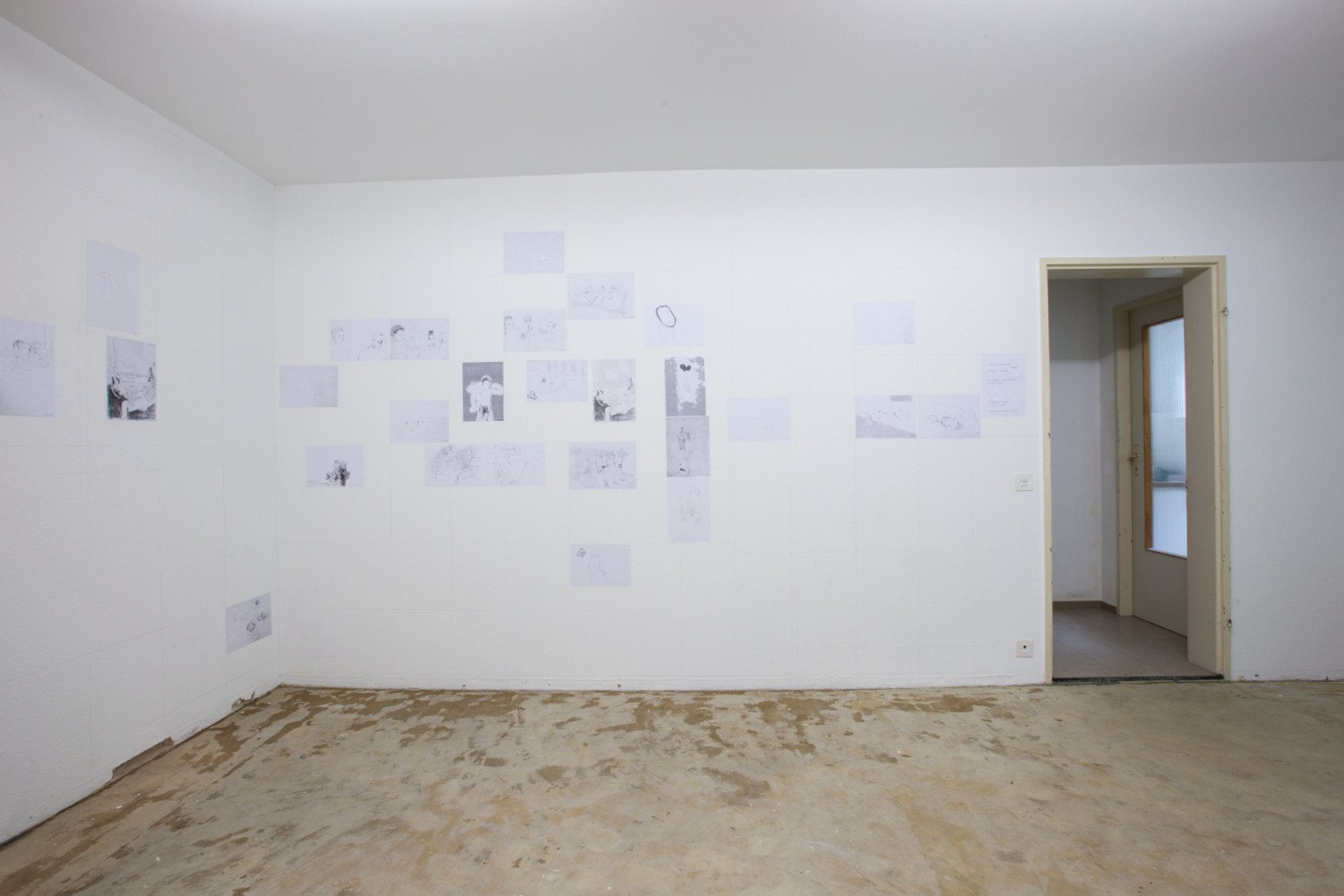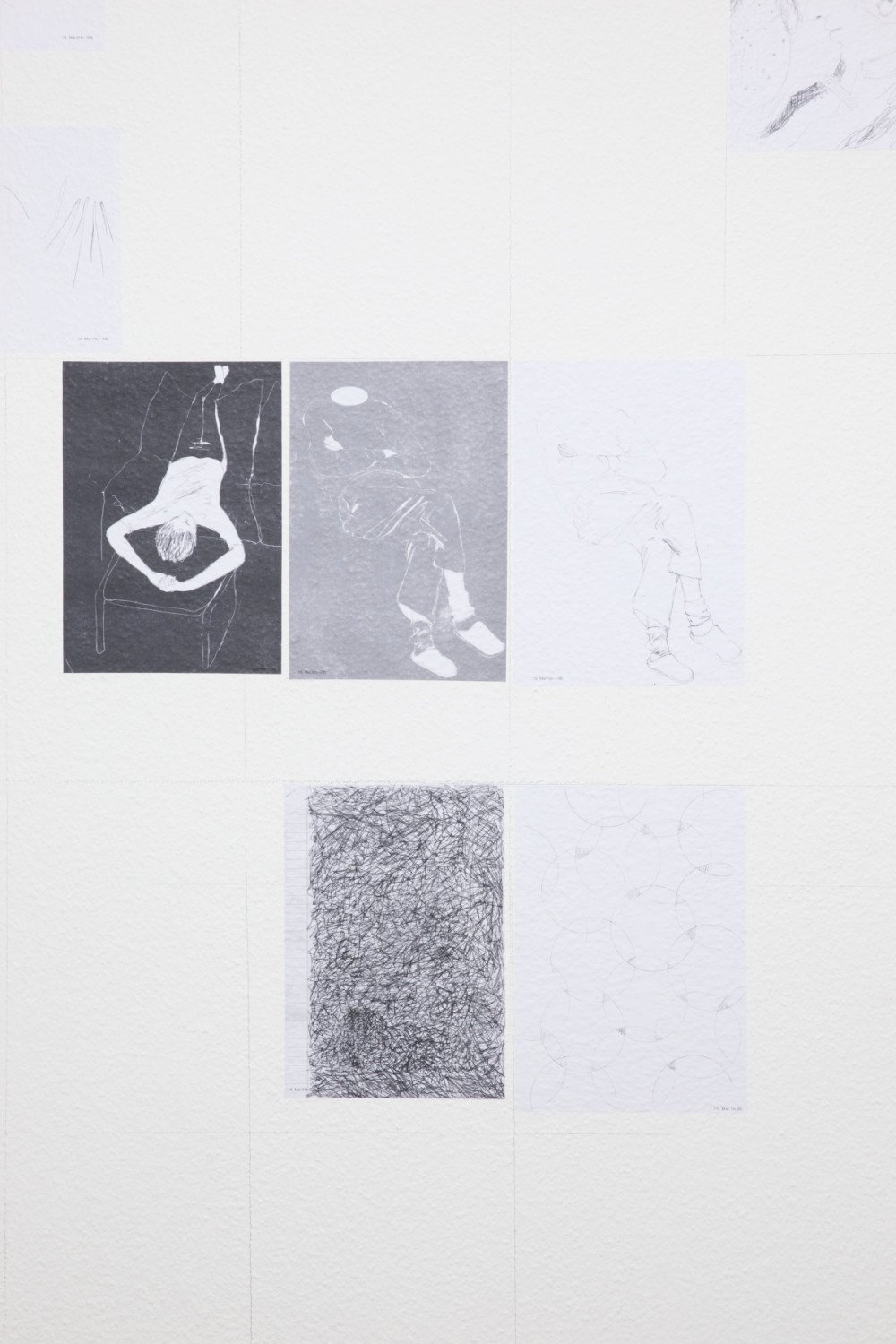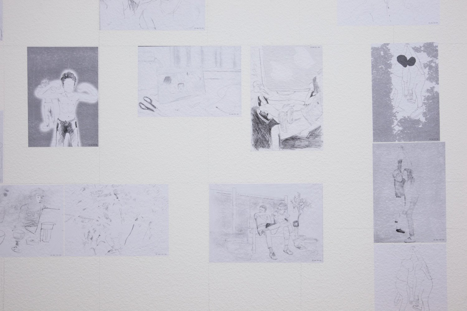 Intertwined legs of young people in a train compartment, a couple sitting on a picnic blanket, a woman touching the back of a baby with her hand... In the next room prints in A4 format have been placed directly on the wall and, unlike the first room, the motifs are juxtaposed, not interwoven but each of them working together as part of a large net. The date at the lower right-hand edge arranges the drawings in a temporal sequence within a space-filling grid of