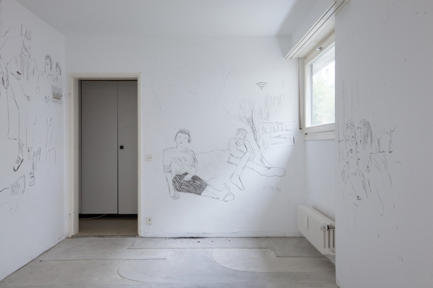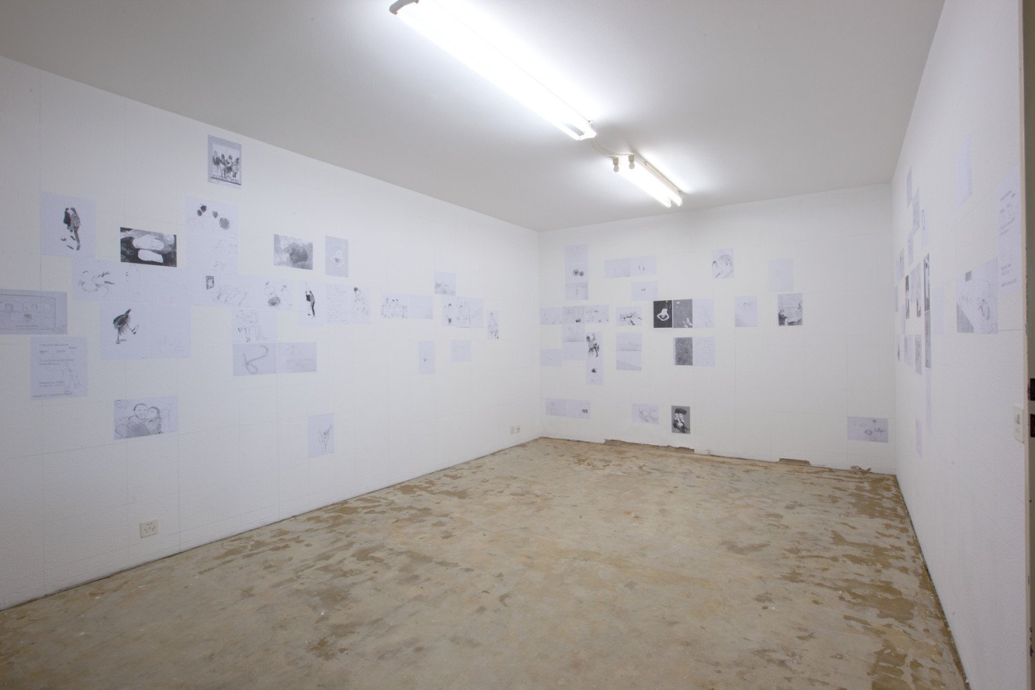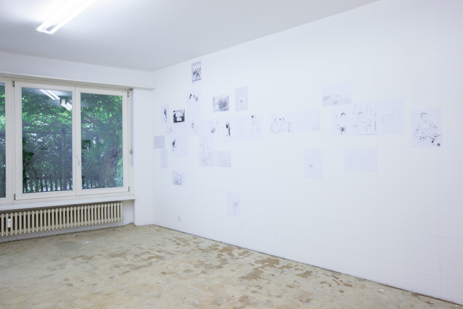 Intertwined legs of young people in a train compartment, a couple sitting on a picnic blanket, a woman touching the back of a baby with her hand... In the next room prints in A4 format have been placed directly on the wall and, unlike the first room, the motifs are juxtaposed, not interwoven but each of them working together as part of a large net. The date at the lower right-hand edge arranges the drawings in a temporal sequence within a space-filling grid of