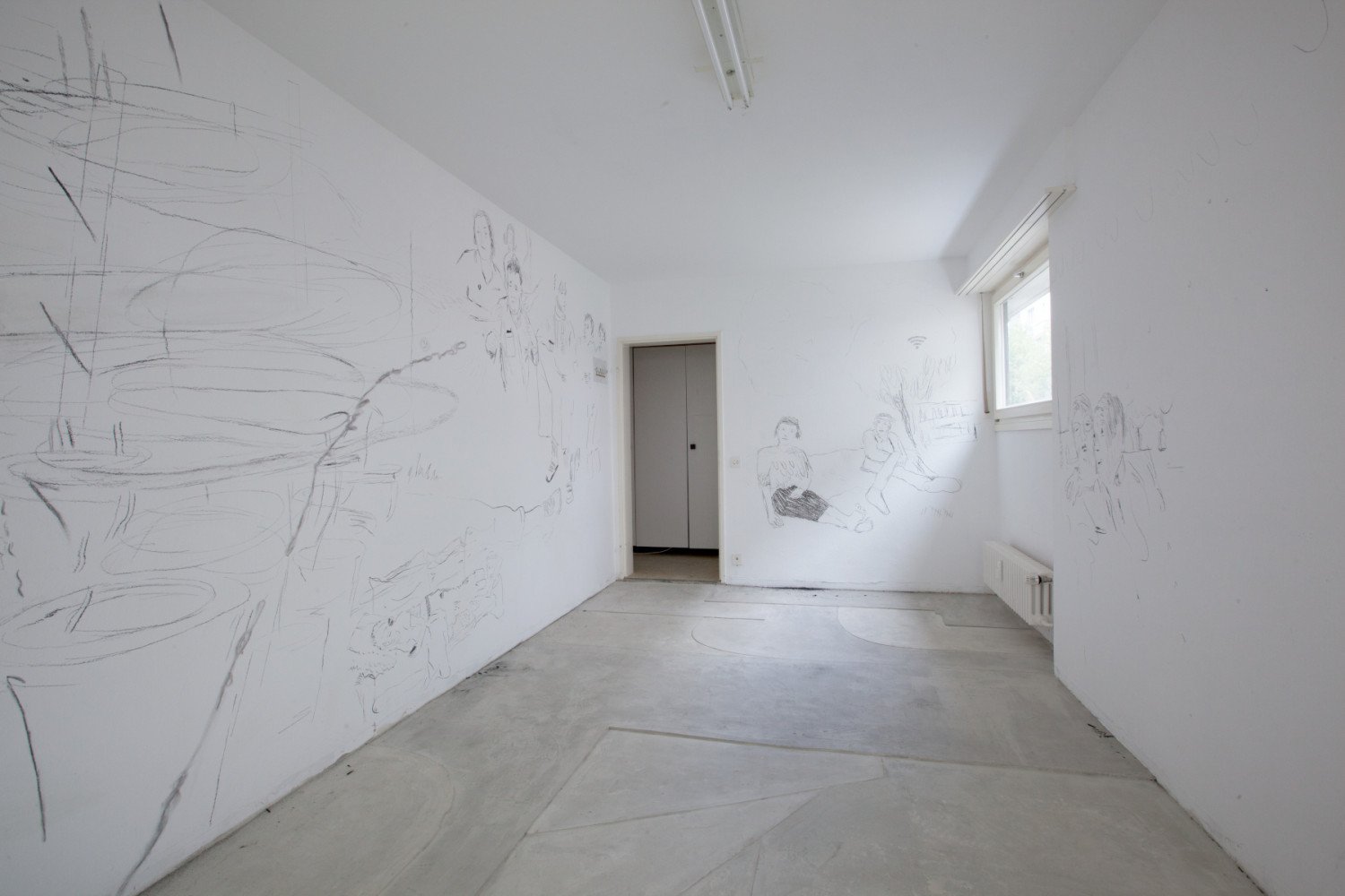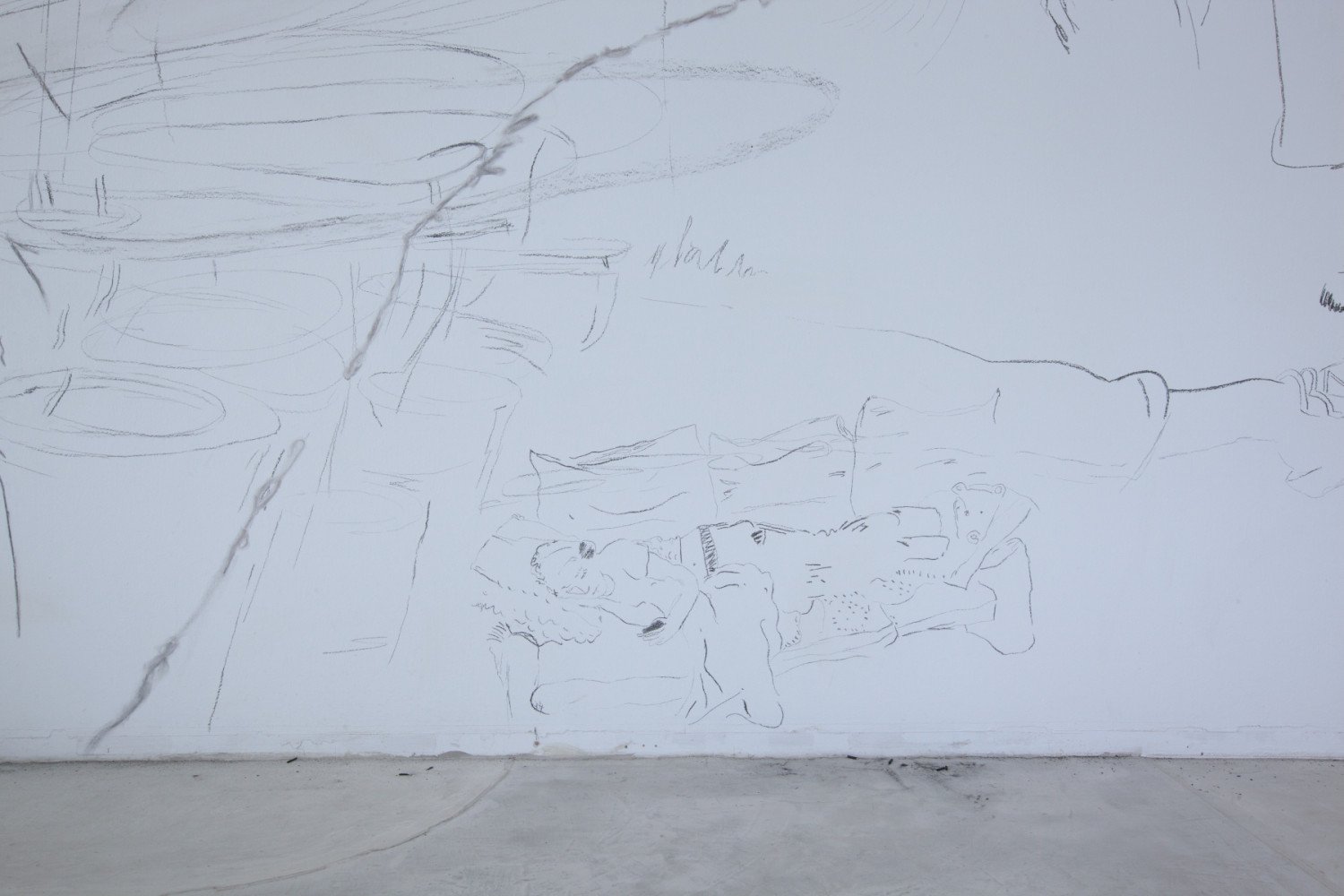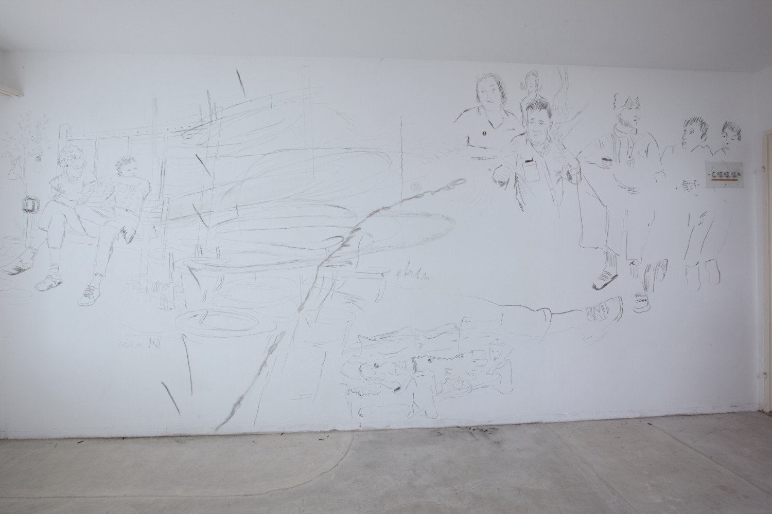 Personal photographs from a pool of all three smartphone photo libraries were used as templates for their drawing sessions, showing particularly social interactions and encounters between people. The selection of the images was random, but it seems that often the (non-)space between the people in the picture aroused their interest. After all, in recent weeks and months, the awareness of interpersonal contacts and the attention paid to how far away we are from our fellow human beings has become particularly important. The sensitivity for distances is omnipresent, so that when entering the first room, viewers are almost surprised at how close the figures sit to each other on a large-format wall drawing. A combination of different motifs overlap in the black-and-white, ephemeral charcoal drawing. They only encounter each other by being transferred to the wall and thus recharge each other.