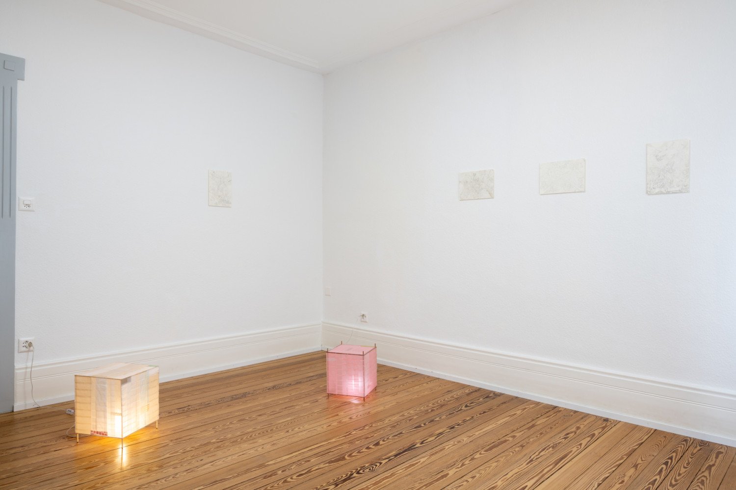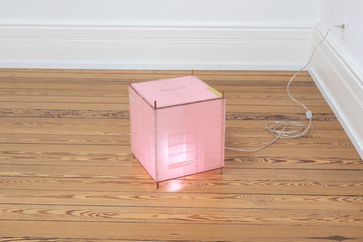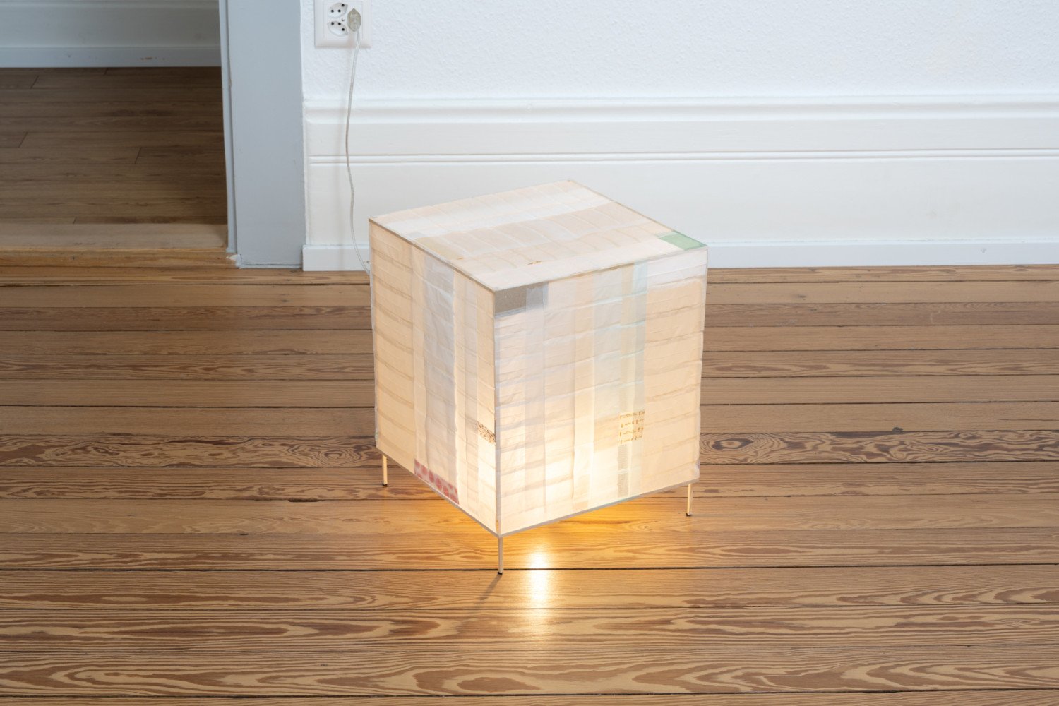 Tomás Maglione. Untitled (from the Probe Pobre series). Cigarette papers, saliva, glue, wood, light bulbs. 36 x 30 x 30 cm. 2024.