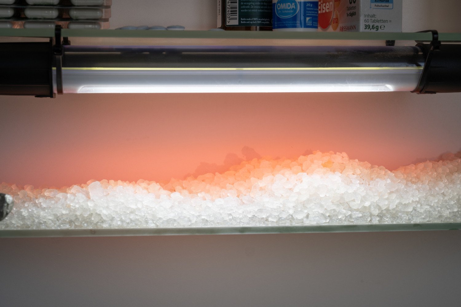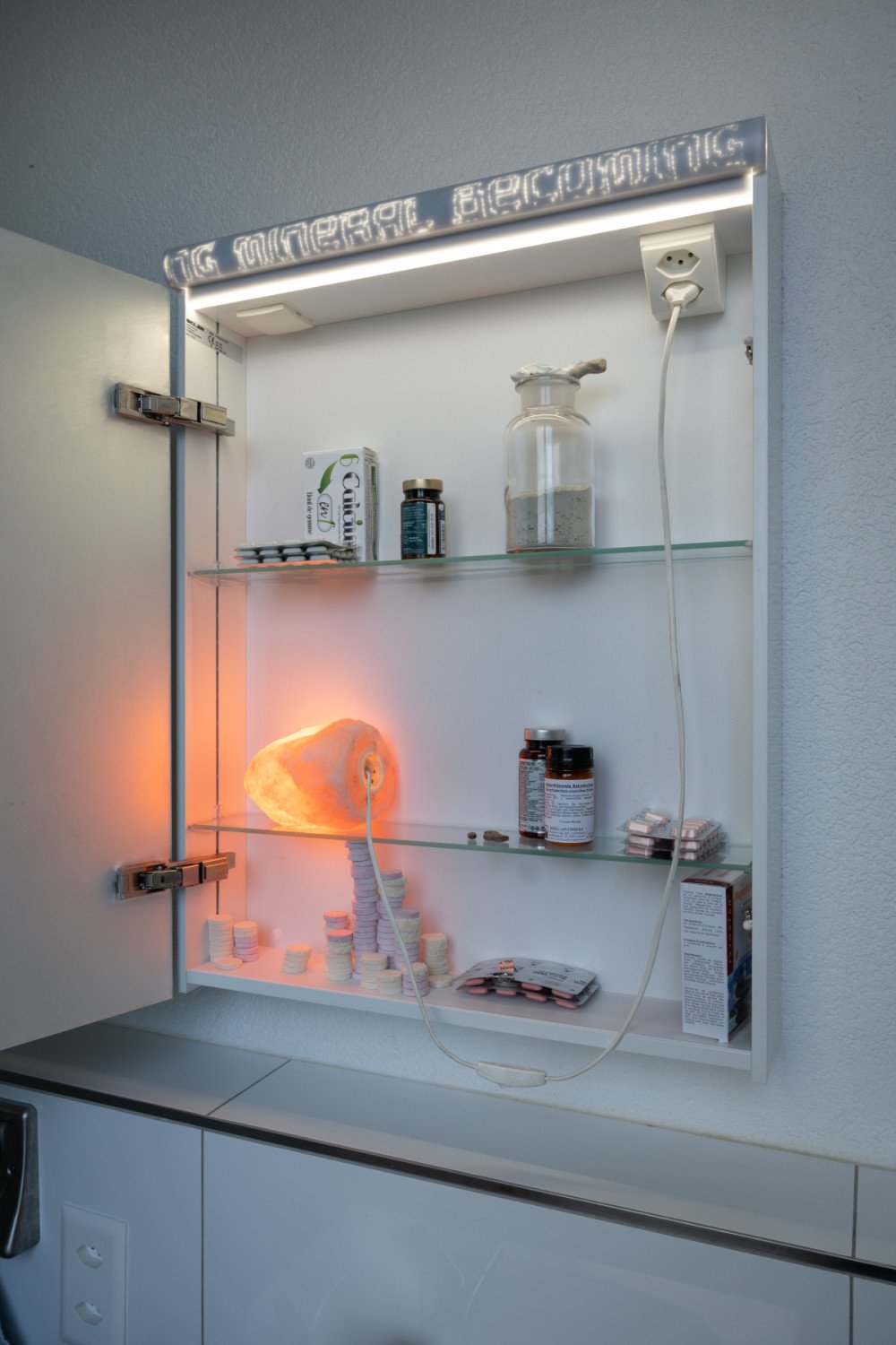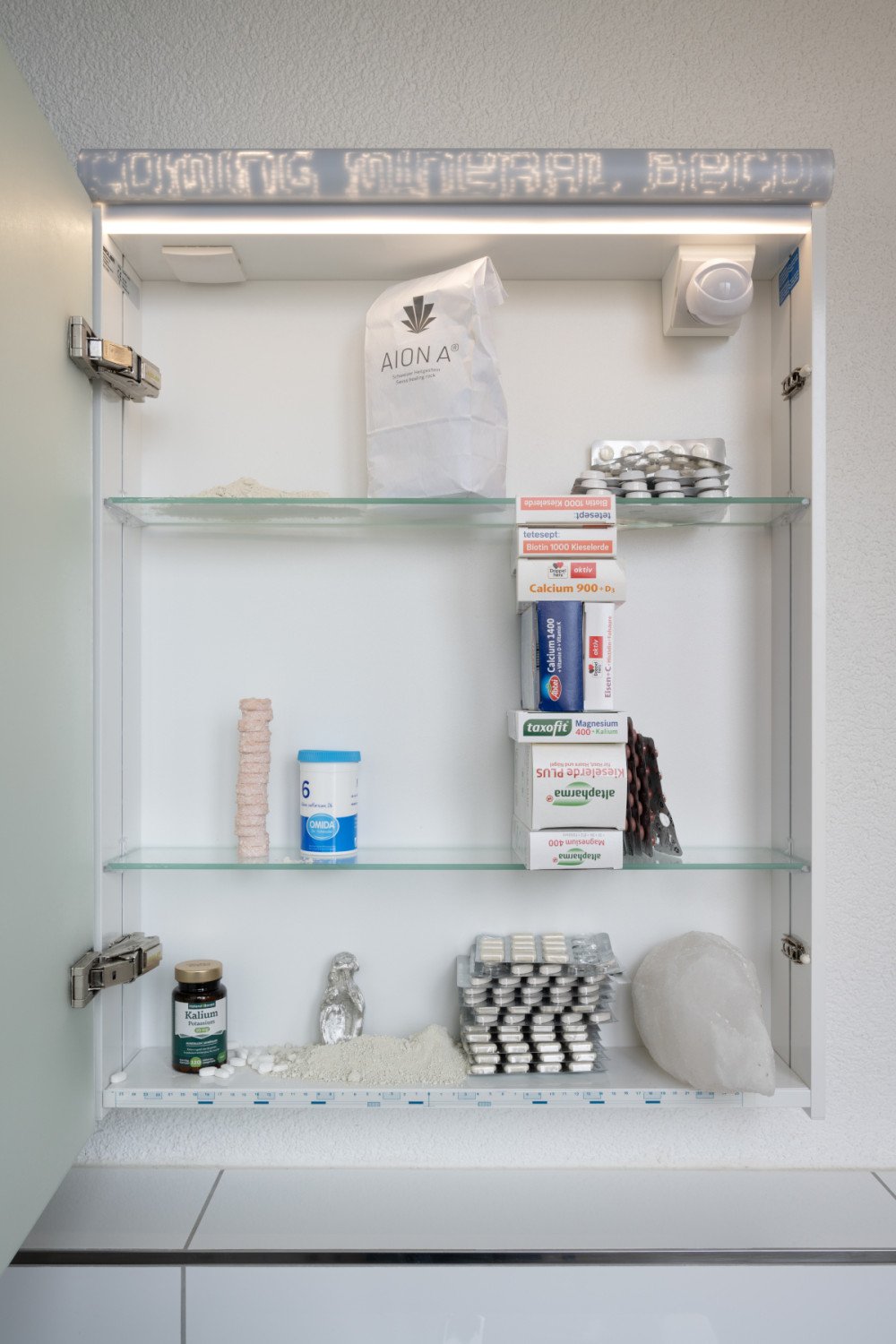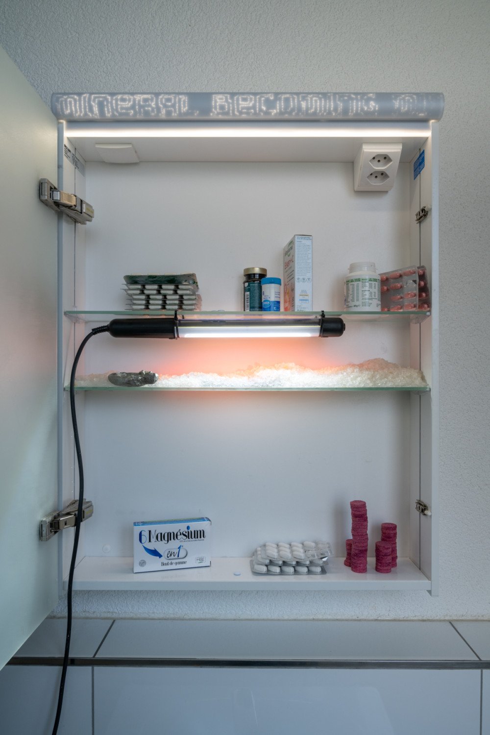 Lithic Alliance. Mineral Bodies. Selection of minerals for consumption, salt, light, toothpaste, cast tin spoon by Madeleine Noraas. Variable dimensions. 2024.