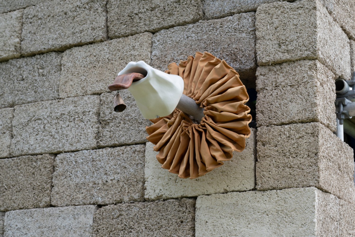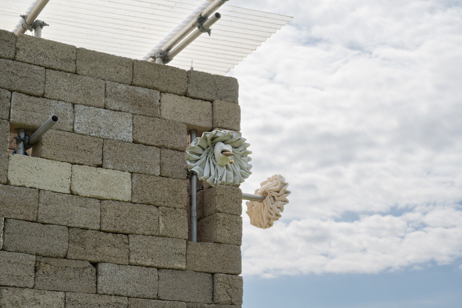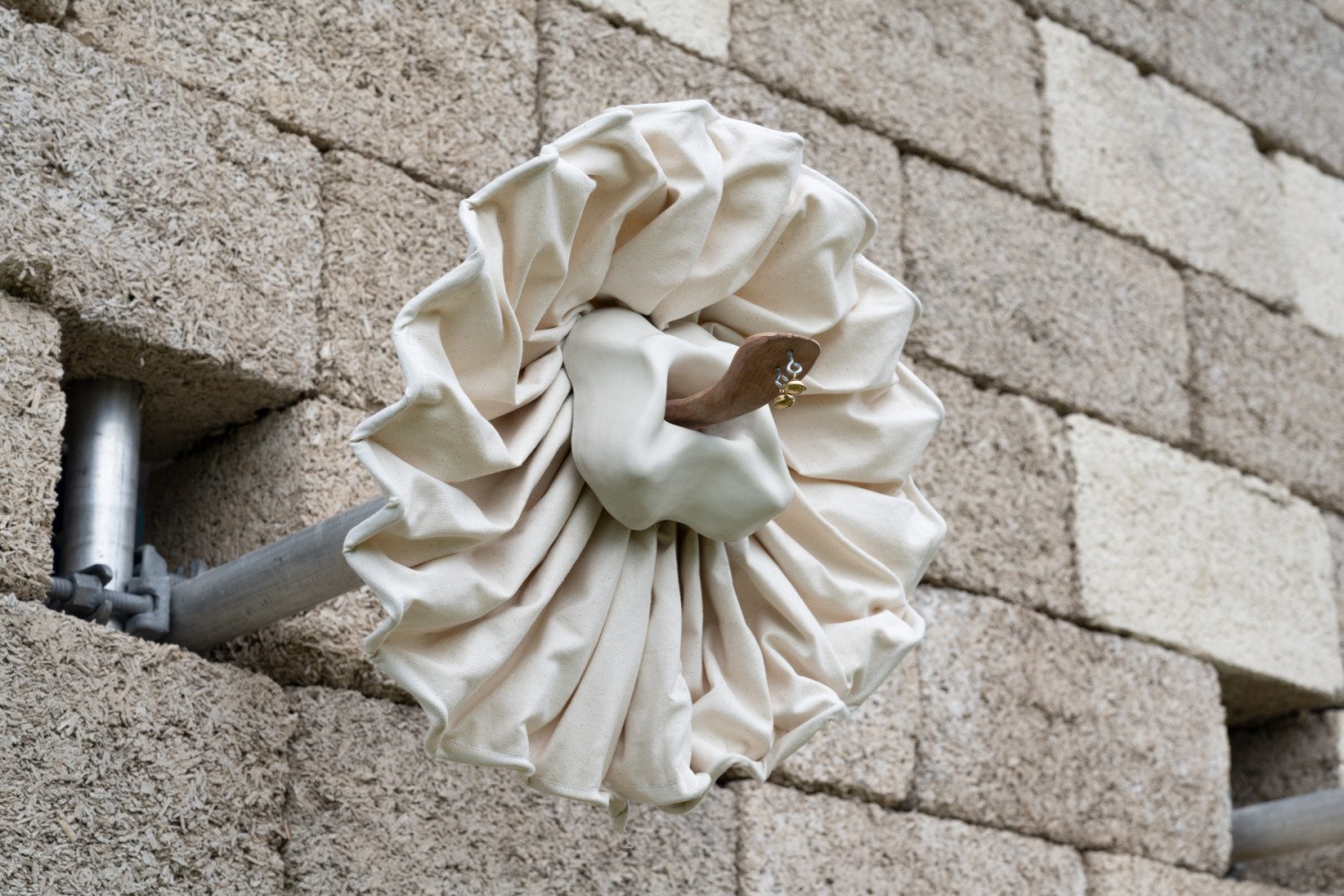 In the third edition of the mobile structure 'On Foot,' artist Gina Proenza has created works that interact with its form, and boundaries, in different ways. Some of her pieces dissolve the exterior of the structure, while others connect to it or turn away.