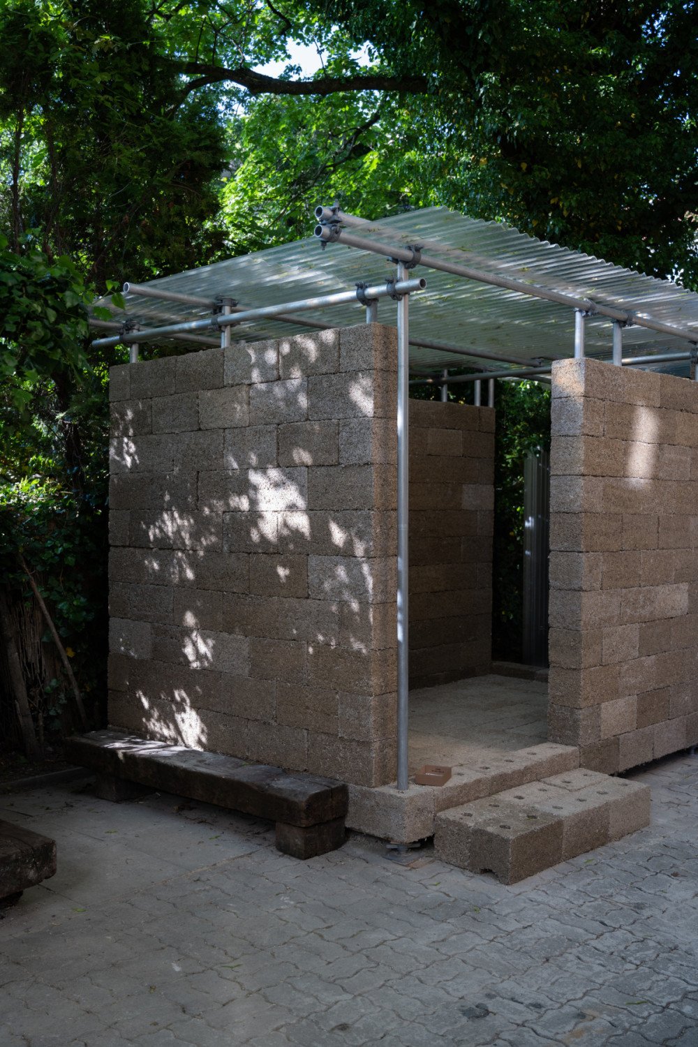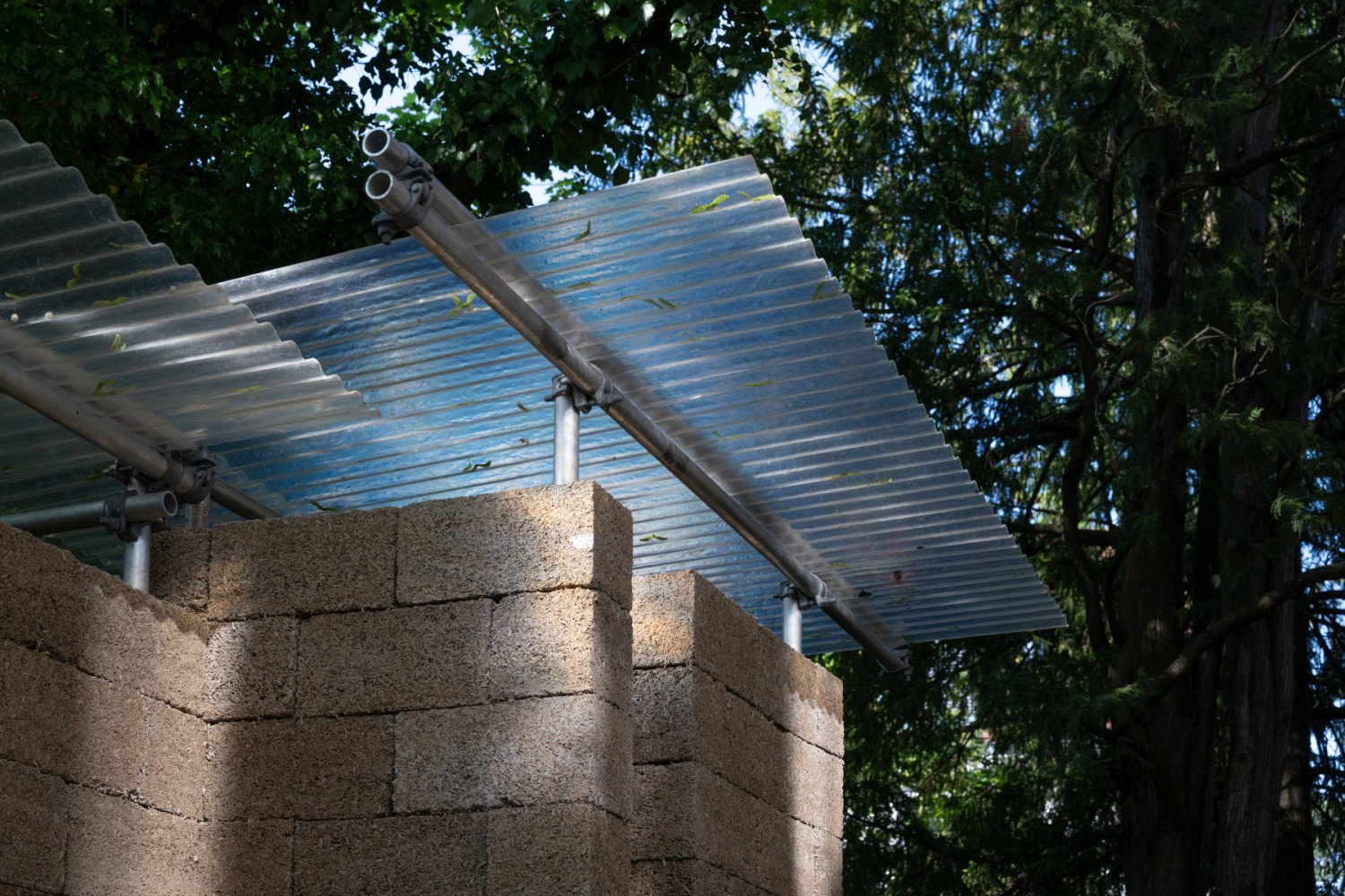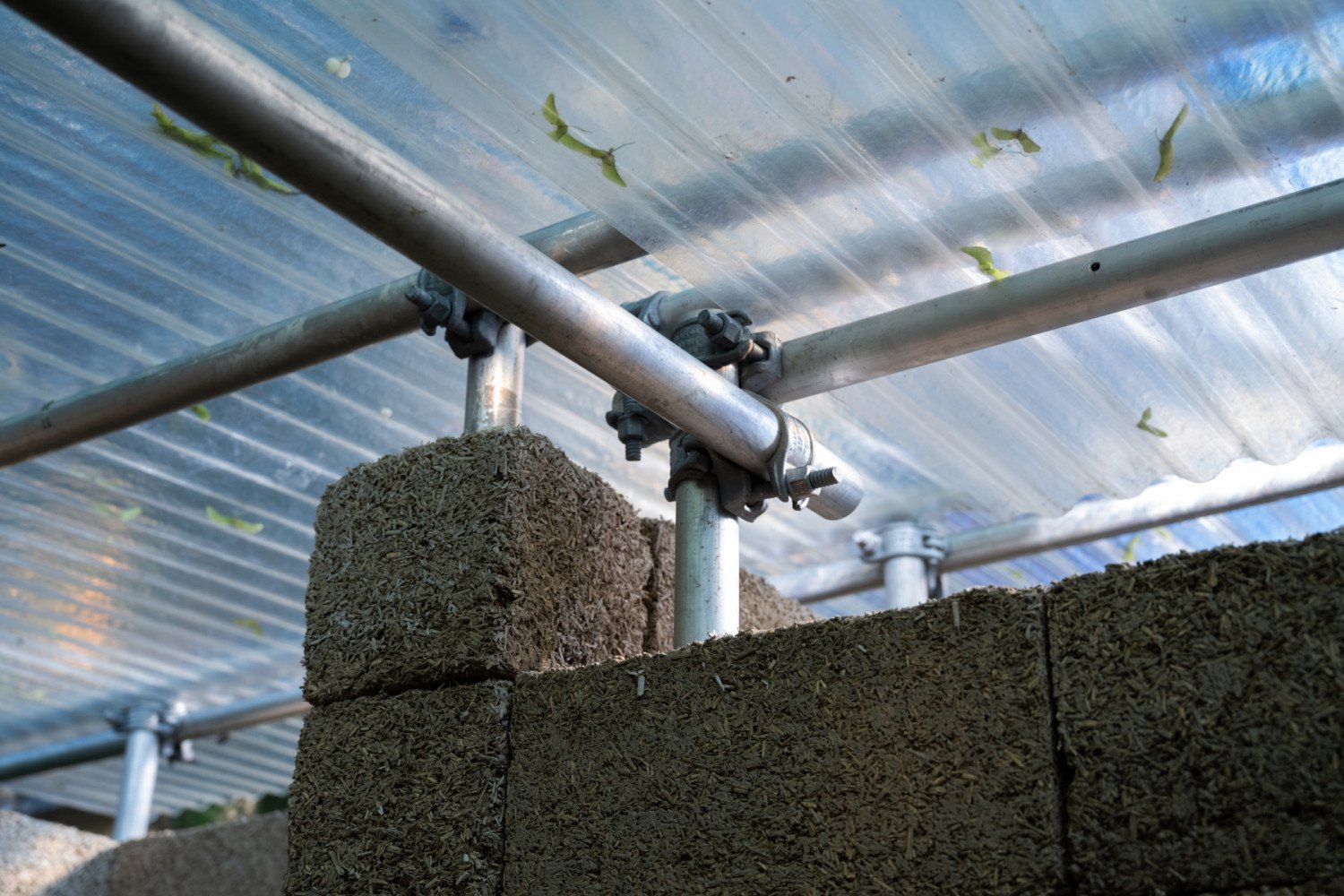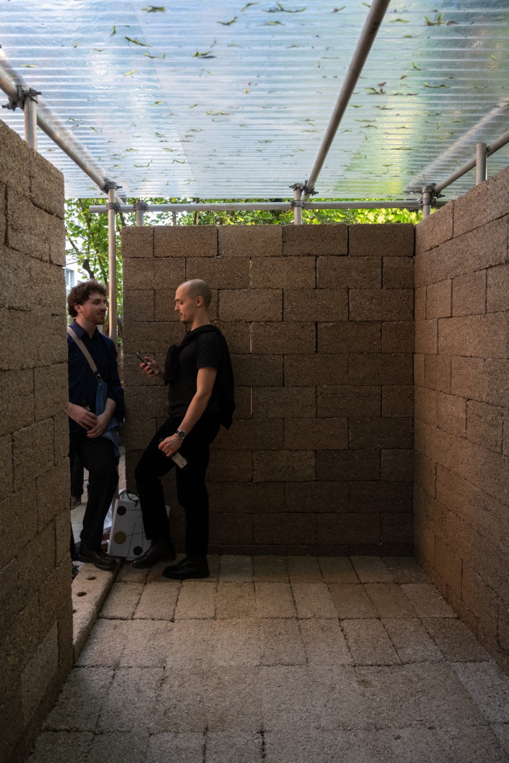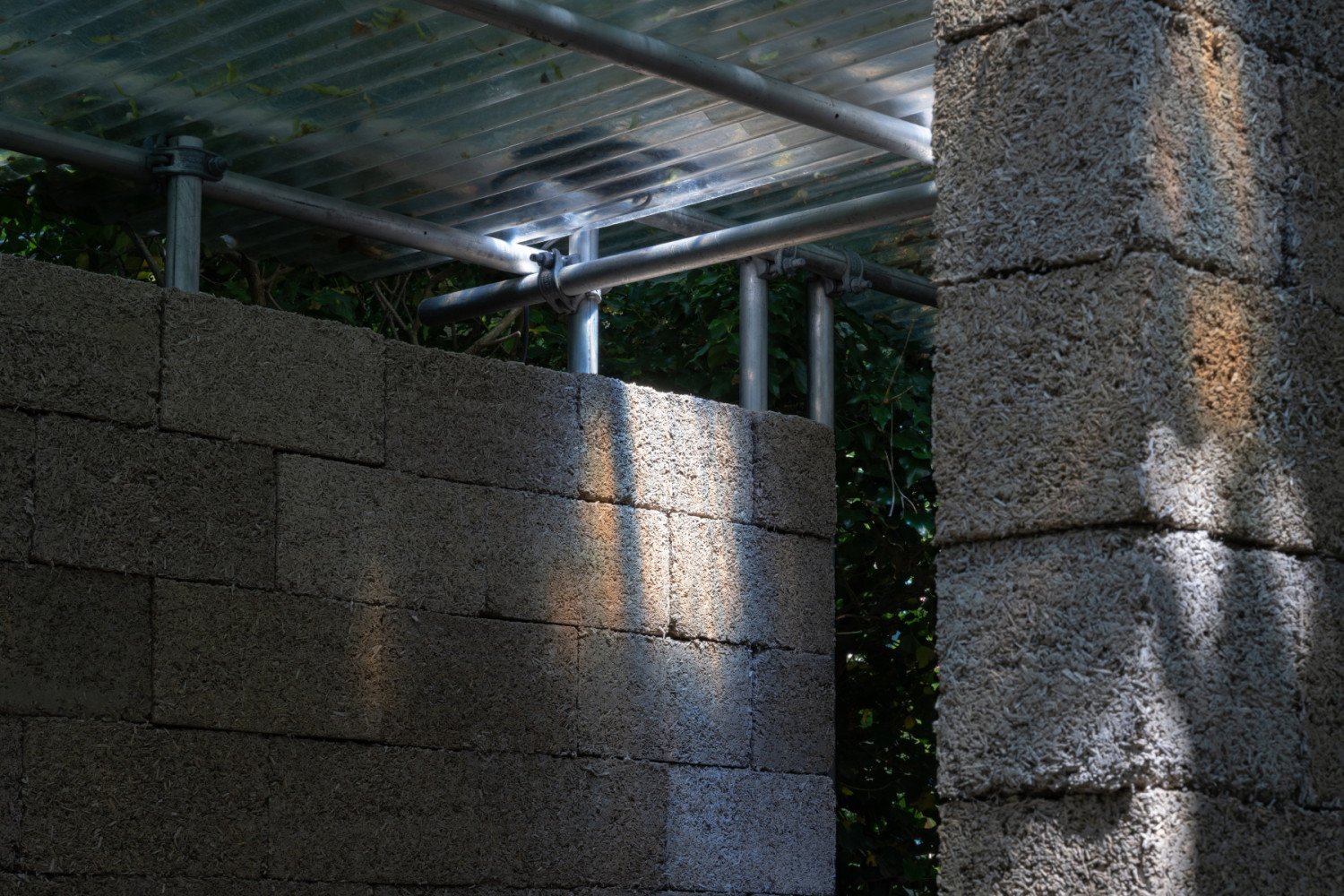 Considered as an extension to our current exhibition space, this structure is made of a mobile and interchangeable stacking system, produced with hempcrete blocks and scaffolding.