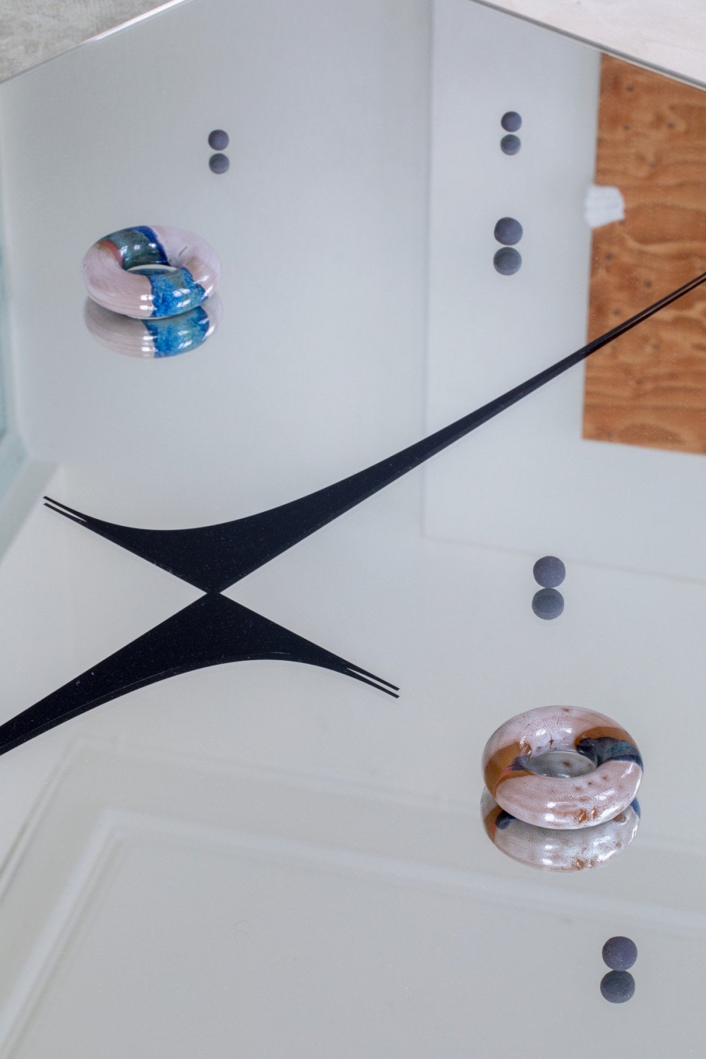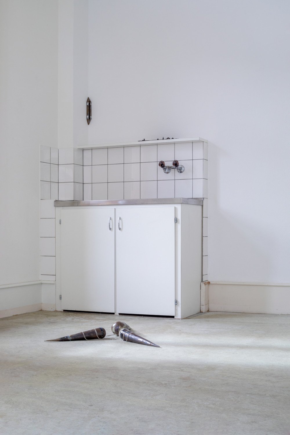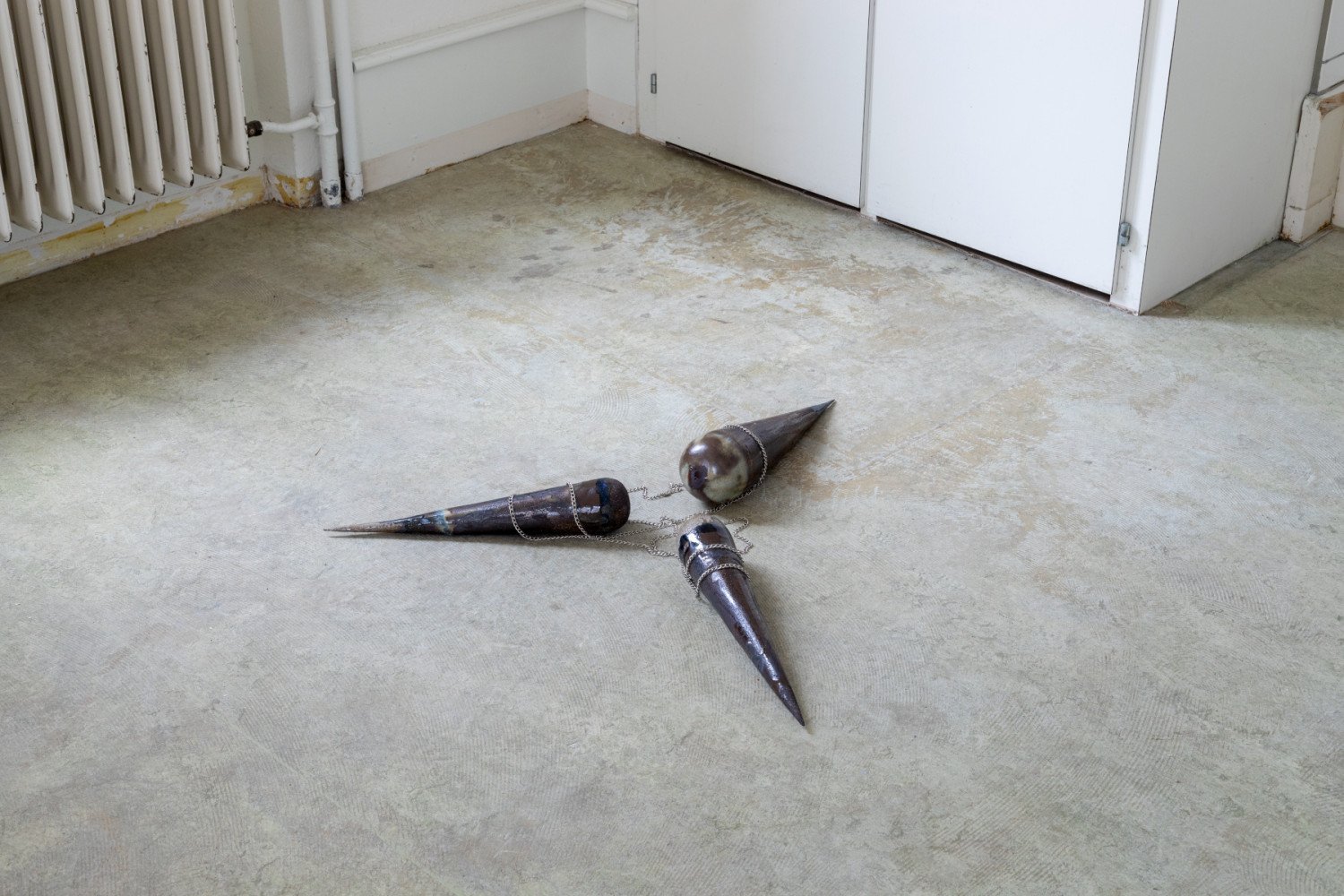 Remy Ugarte Vallejos. Guides, guards and grounds. Ceramics, wood, vinyl and chains. Variable dimensions. 2022.