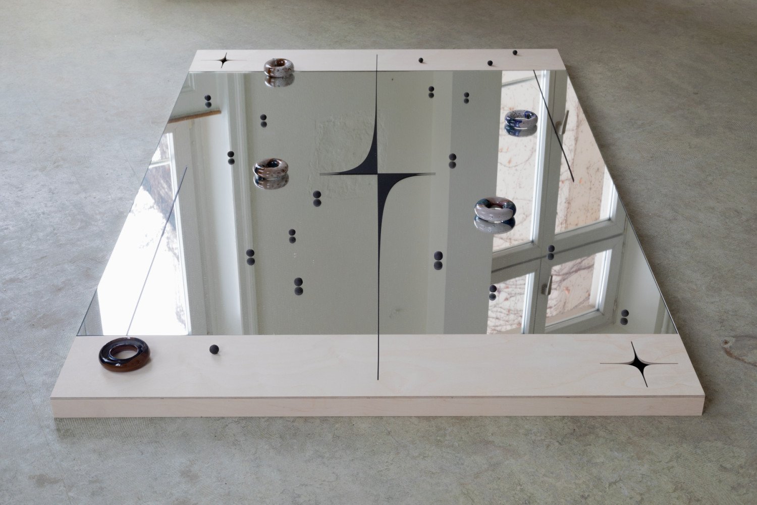 Djellza Azemi. In a sexy way where it’s not obvious. Plaster, paint, plywood, wood wax and mirrors. 91 x 49 cm. 2022.