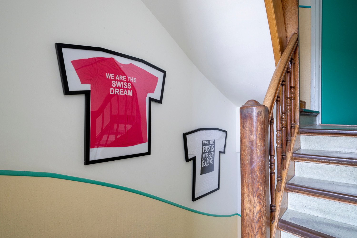 Nusser Glazova. WTF is NG? and We are the swiss dream. T-Shirt and frame. Variable dimensions. 2022.