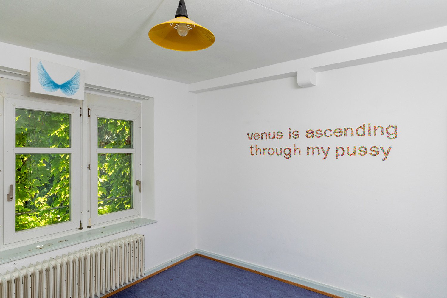 Pauline Coquart. Venus is ascending through my pussy. Plastic pearls, 164 x 36 cm. 2022./Loving everything far the first time. Oil on canvas, 30 x 45 cm. 2022.