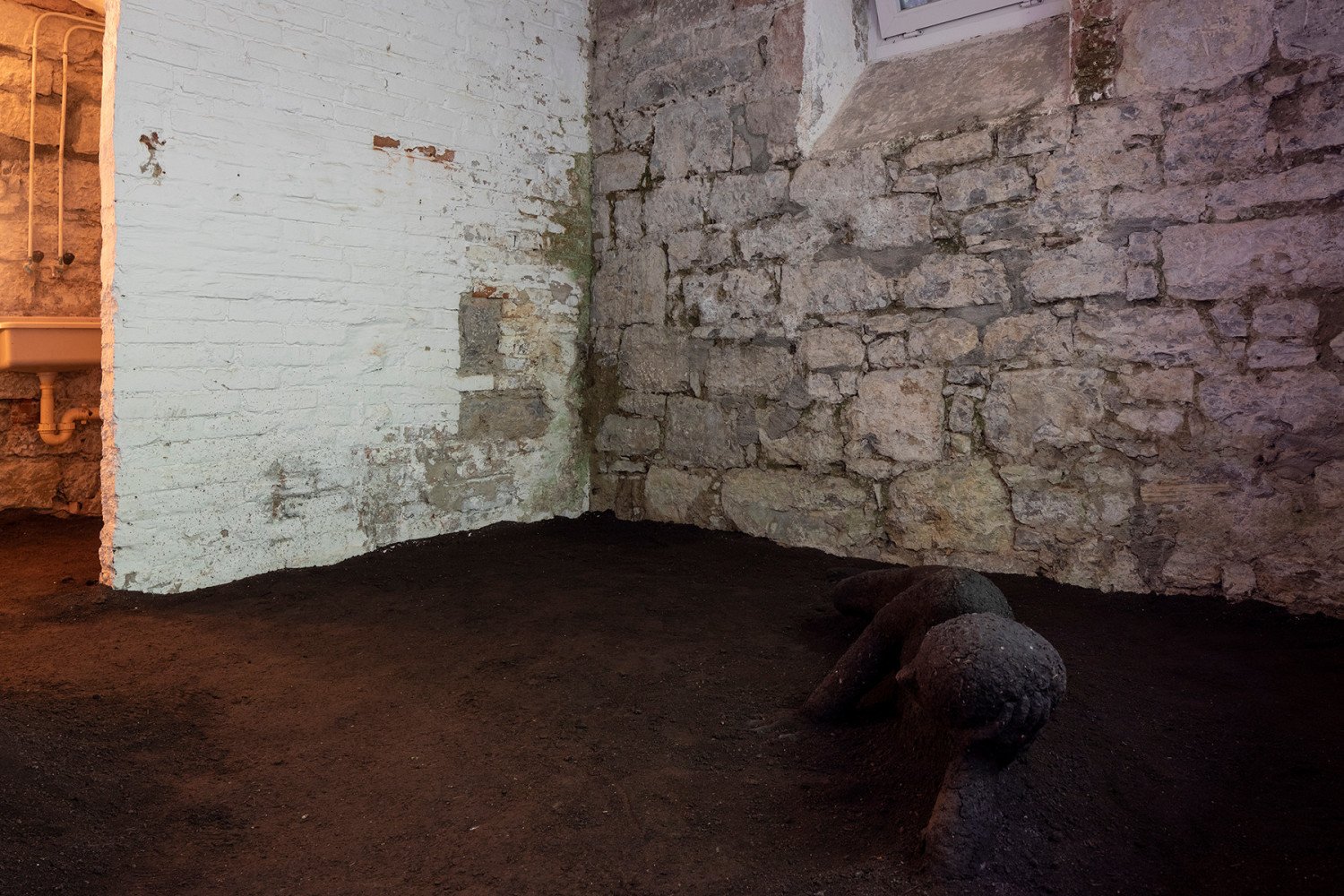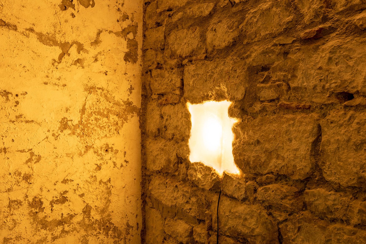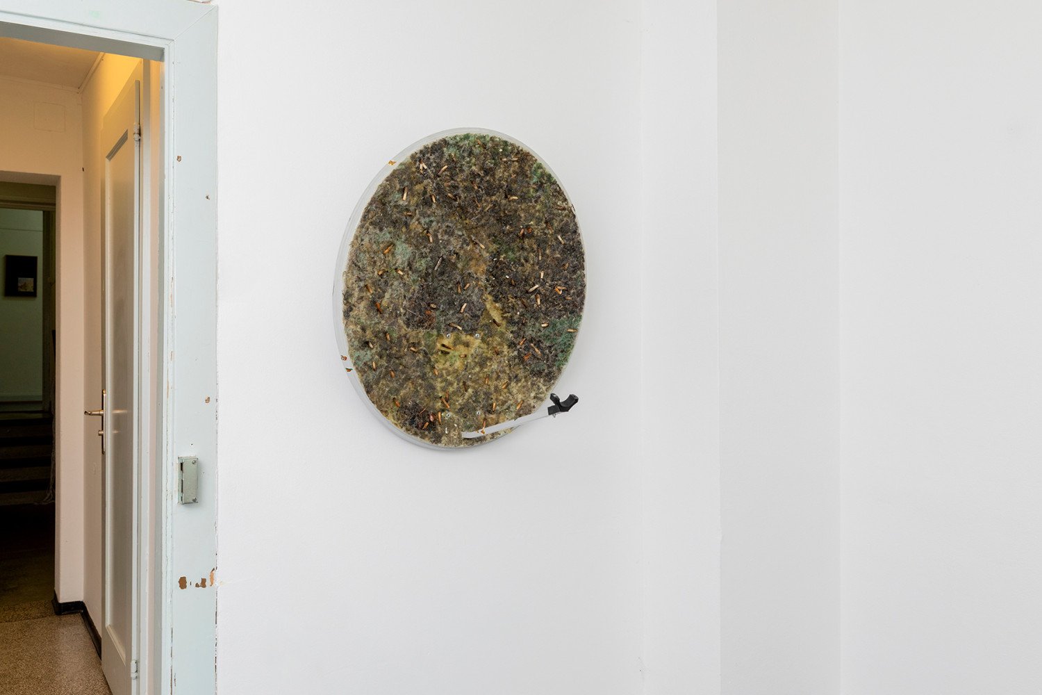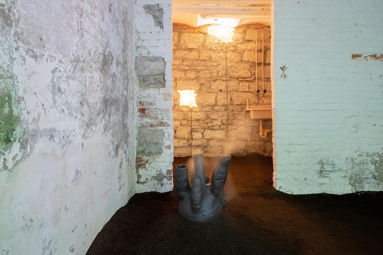 Leonardo Bürgi. The contemplation of a present absence. Soil, wheat paste, wood, wire, mesh, ceramic, ultrasonic, ultrasonic fogger, fan, water, rosemarin hydrolate, wisteria extraction, bee wax, light bulb and aluminium foil. Variable dimensions. 2022.